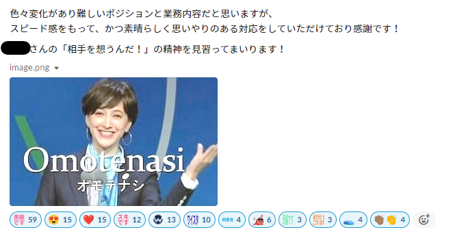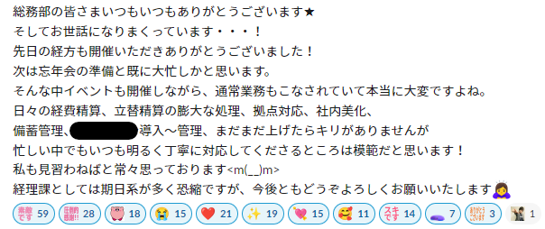 普段はなかなか伝えられない感謝の言葉や、同僚や部下の活躍など、「GOOD」なエピソードを相手に直接メンションをつけて投稿していくワイスタは、11月の制度スタート以降とても盛り上がっています。投稿を見た従業員からはリアクションスタンプが連打されることも!