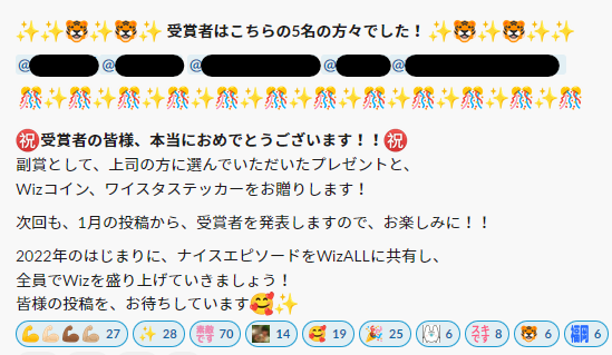 ワイスタに投稿された内容をもとに毎月表彰があり、なんと副賞もあるんです。〇〇円分の副賞とWizオリジナルコインやステッカーがプレゼントされることも投稿が白熱している理由かもしれませんね。