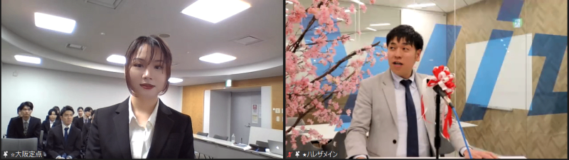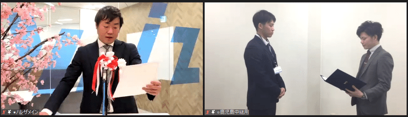 その後、辞令交付に移ります。各支社の辞令交付の様子をオンラインで繋いでいきました。今回の新入社員の中には、鹿児島レブナイズのセカンドチーム「Red Monsters(レッドモンスターズ)」の皆さんも!