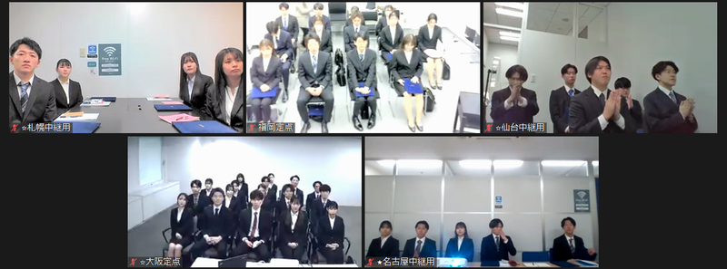 全国にある各支社をオンラインで繋ぎ、入社式がスタート!本日、皆さんにこの場に集まっていただくことができ嬉しく思います。オープニングムービーでは各事業部長の紹介と、役員陣からのメッセージが映し出されました。