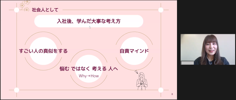 「昨年の今頃は、様々な思いを持ちながら就職活動に取り組んでいました。社会人として活躍する自らを想像する一方で、思い描くようななりたい自分になれるのか、不安を感じる時間の方が多かったように思います。