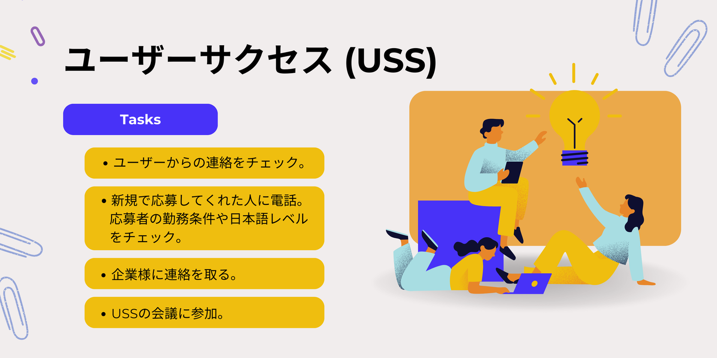 ユーザーサクセス(USS)は、電話を通じて、日本に住んでいる外国人の方にお仕事を紹介するポジションです。