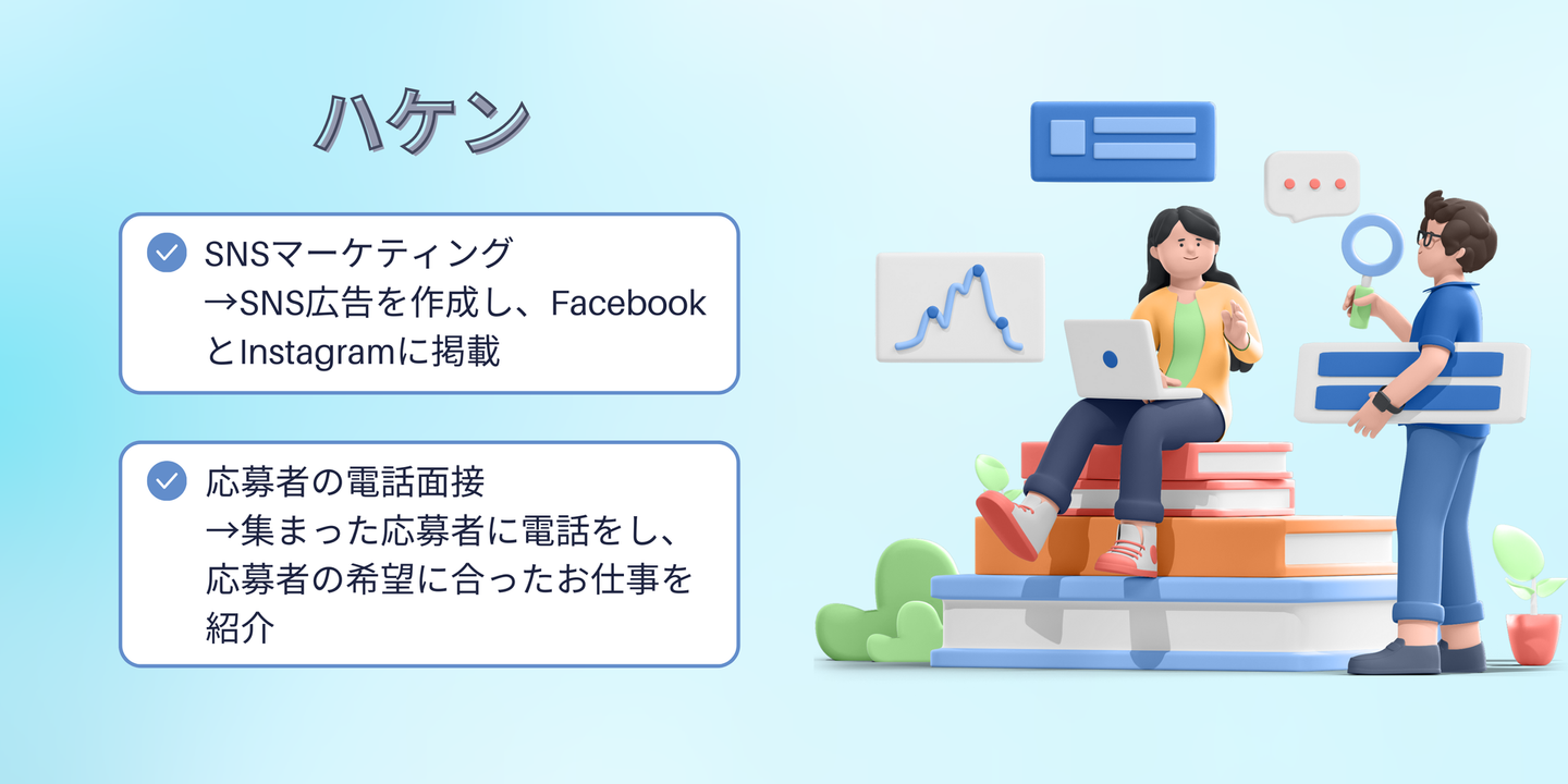 ハケンは、SNSを利用したマーケティングと日本に住んでいる外国人のキャリア支援の両方を経験できる、貴重なポジションです!