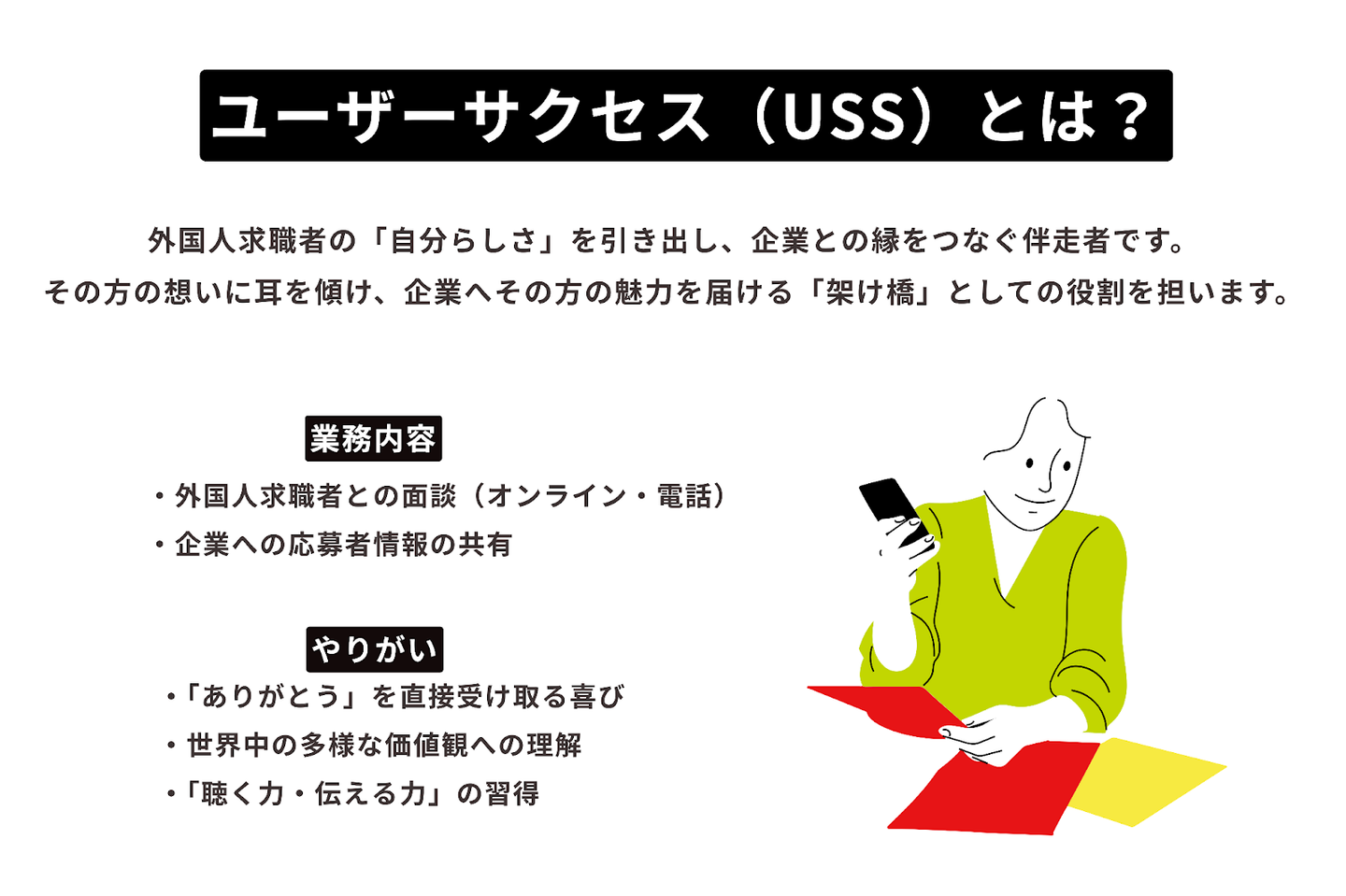 Guidableは、日本でお仕事を探している外国人と人手不足に悩む企業を繋ぐ役割を担っており、僕たちユーザーサクセス(以下:USS)部門での主な業務は、電話や面談を通じて、求職者の方々をサポートすることです。