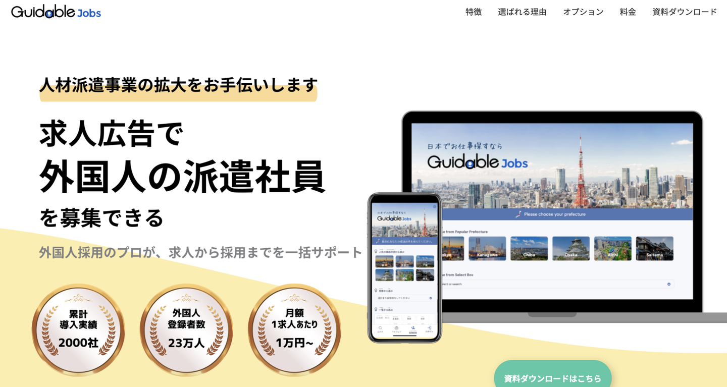 メインサービスの「Guidable Jobs」では23万人の外国人求職者のユーザーが登録していて、1ヶ月の求人掲載で平均15人の応募が集まるサービスです。総フォロワー数が5.5万人のSNS運用、月刊PV数20万の自社メディアサイト「Guidable Japan」を用いた外国人集客のマーケティング力によって実現されています。