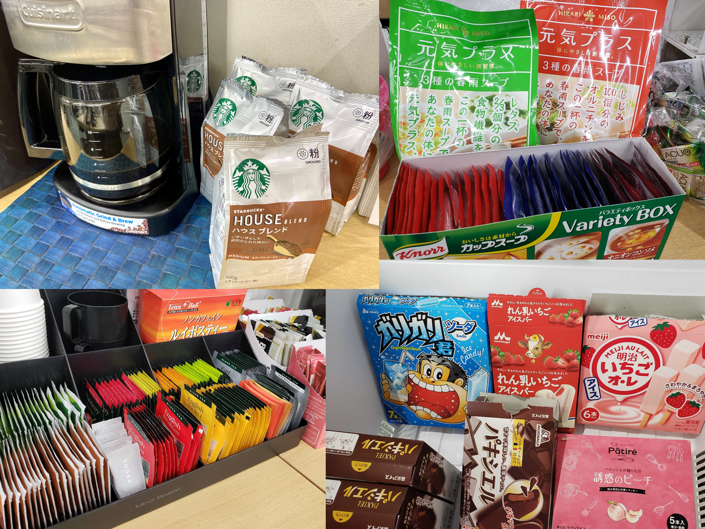 ドリンクフリー!お菓子フリー!アイスフリー!です。ドリンクはとても充実しています。コーヒーは豆とマシンにこだわっており、ほかにもハーブティー、ココア、紅茶、緑茶、炭酸水やジュース、ミネラルウォーターなど、ひととおりの飲み物がそろっています。お菓子やアイスもありますよ!