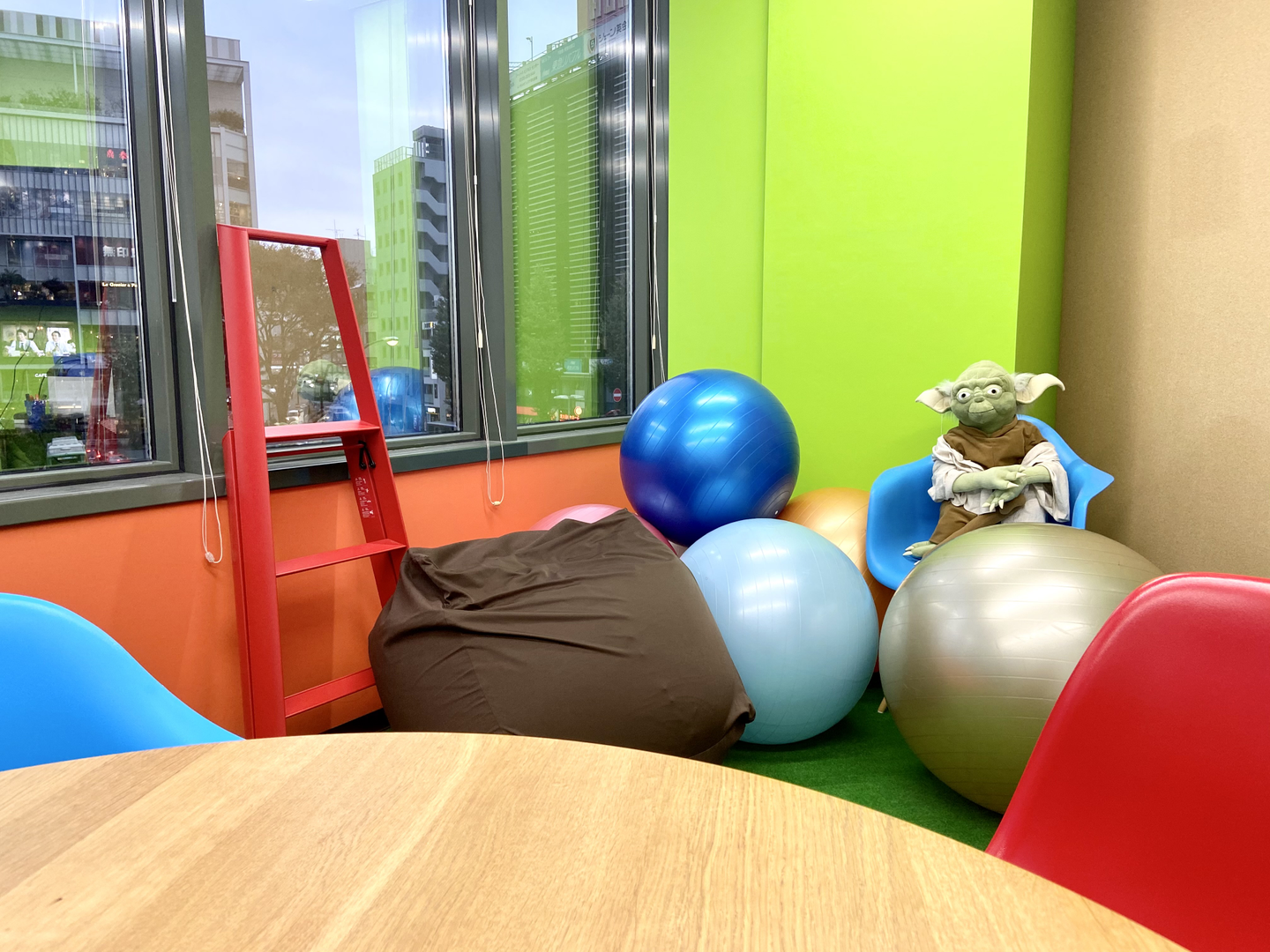 ここは来客用ではなく、主に所内のミーティングで使用する会議室です。たくさんのバランスボールやビーズクッションなどがあり、法律事務所っぽくないカラフルさがGVAらしくて、明るく自由でのびのびとした雰囲気です。
