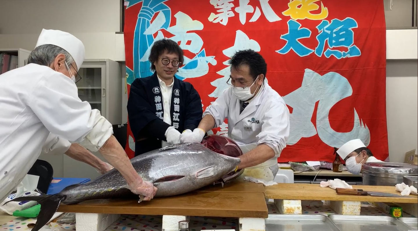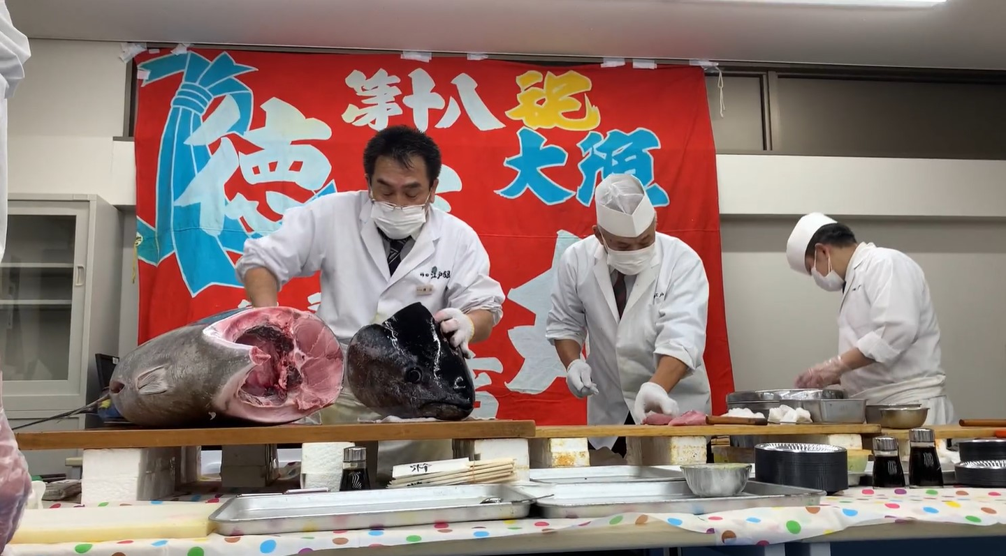職人さんたちの魚さばきってすごいですね。サクサクさばいていきました。さばいたマグロは握りや中落ち丼などにしていただき、みんなでおいしくいただきました!