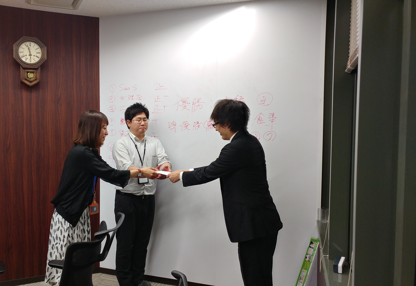 丸一日、各チームのプレゼント議論を重ねて、最後は全メンバーによる投票の結果、弁護士飛岡と司法書士小林のチームによるプレゼンが優勝し、所長の山本より景品が送られました。