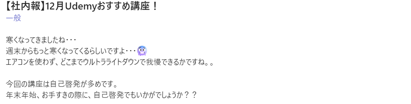 源田「後はT.HiranoさんのTeamsのアナウンスといえば独特のブログ構文ですよね!最初の入口の文章がおもしろいので、なんだなんだ?って読み進めてしまう内容なのでいつも楽しみにしています(笑)!」
