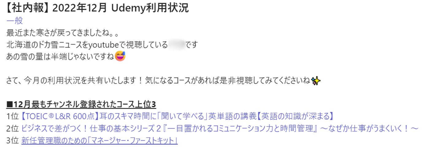 T.Hirano「最初は地道にどこのジョブや部署で活用が少ないかなどを分析しながら、周りのリーダーや他部署の方も巻き込んでUdemy Businessの周知活動をしていました。本当に地道にコツコツ周知活動を続けていましたね…こういった地道な周知活動の結果、受講者の増加もあって、会社の必須受講としてこのUdemy Business講座を受けてもらう、みたいのもできましたね。