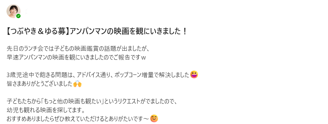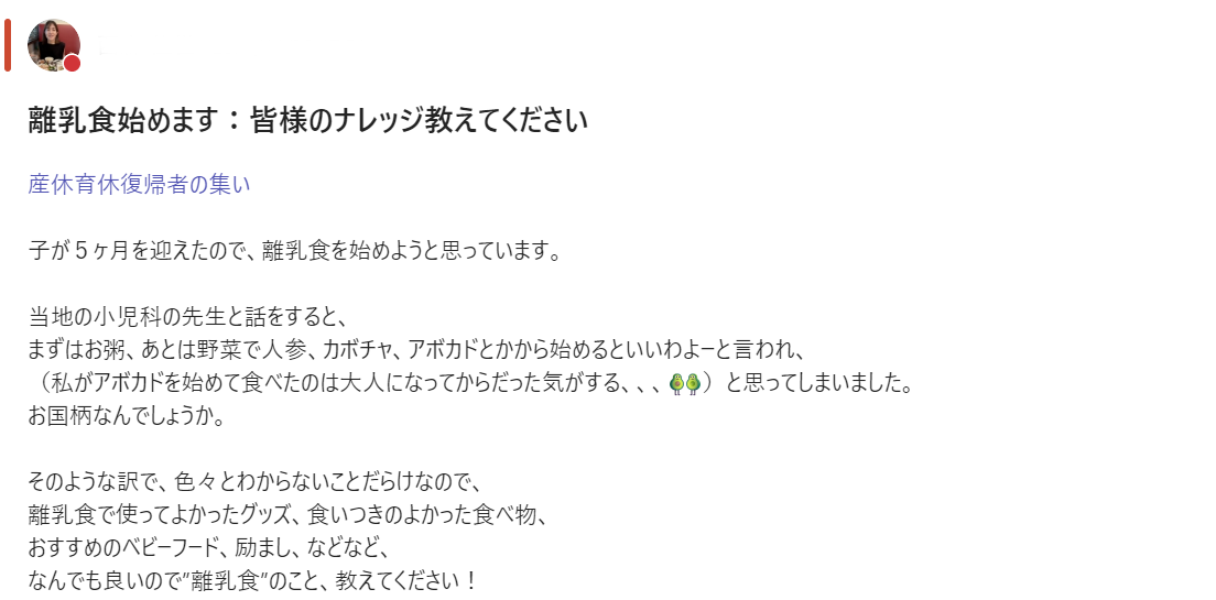 実際の相談内容をお見せします!下記画像のように子供と一緒に楽しめる映画や、離乳食デビューに当たっての情報収集などなど……。投稿があった相談に対して、色々な回答が飛び交っており、気軽に相談ができるママ友・パパ友のコミュニティになっています✨