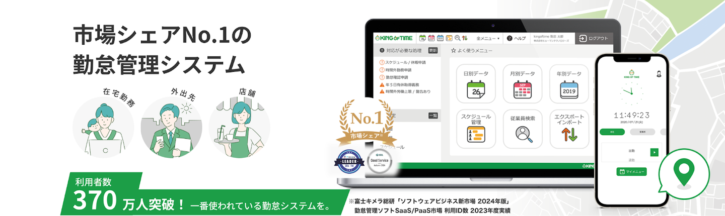 最近では、スマートキャンプ株式会社が主催する「BOXIL SaaS AWARD Summer 2024」にて、「KING OF TIME」が勤怠管理システム部門で「Good Service」「サポートの品質No.1」「営業担当の印象No.1」を、「KING OF TIME 人事労務」がタレントマネジメントシステム部門で「Good Service」をそれぞれ受賞するなど、サービスの見せる可能性はまだまだ広がりつつあります。
