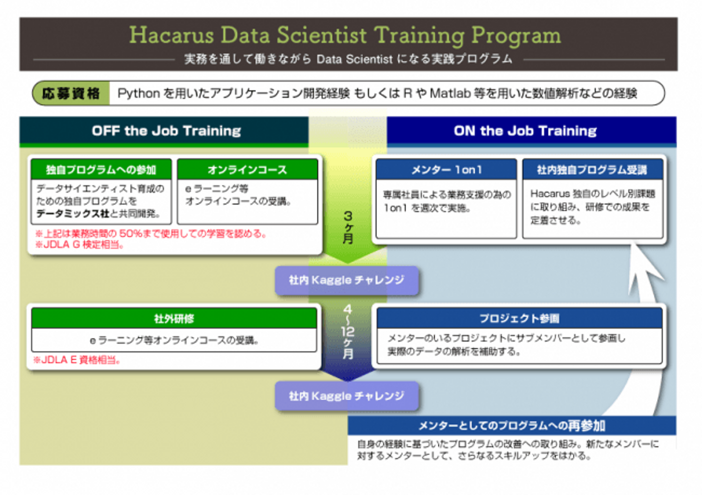 今回、私たちは、データサイエンティストの人材育成の大きな実績を持つデータミックスさんと連携し、データミックスの提供するプログラムと、ハカルス社内で行うプログラムを掛け合わせ、座学と実践のバランスのよいプログラムの開発に取り組むことにしました。