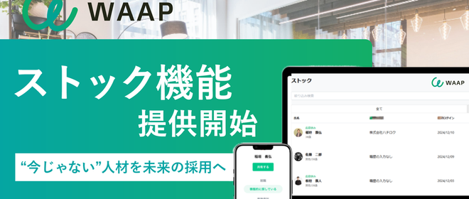 当社が運営する、企業と個人のダイレクトマッチングプラットフォーム「WAAP(ワープ)」は、候補者と継続的な関係を築き、採用チャンスを最大化する「ストック機能」の提供を開始しました!採用候補者の情報をストックして管理できるため、継続的な関係を維持し、最適なタイミングで再アプローチすることで採用チャンスを広げます。さらに、ストックした求職者の転職意欲や就労状況に変化があった際には企業へ自動通知が届く仕組みを搭載。今すぐではなくても、いつか採用に結びつけたい候補者とのつながりを保ち、採用のタイミング最適化を実現します! WAAP 公式サイト(企業・自治体向け):https://waap.jp/...
