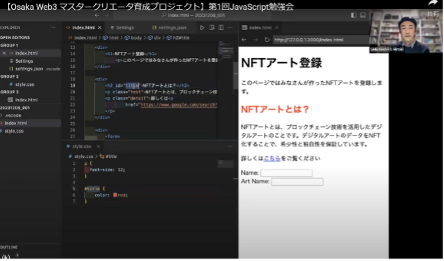 Osaka Web3 マスタークリエータ育成プロジェクトの採択者を対象に、Web3技術を用いたアプリケーションを実装する際に必要なスキルであるJavaScriptの勉強会が開催されました。講師として、弊社インストラクターの柴原 洋紀氏が招かれ、第1〜3回目の講義はオンライン、第4回目の講義はオフラインにて実施しました。