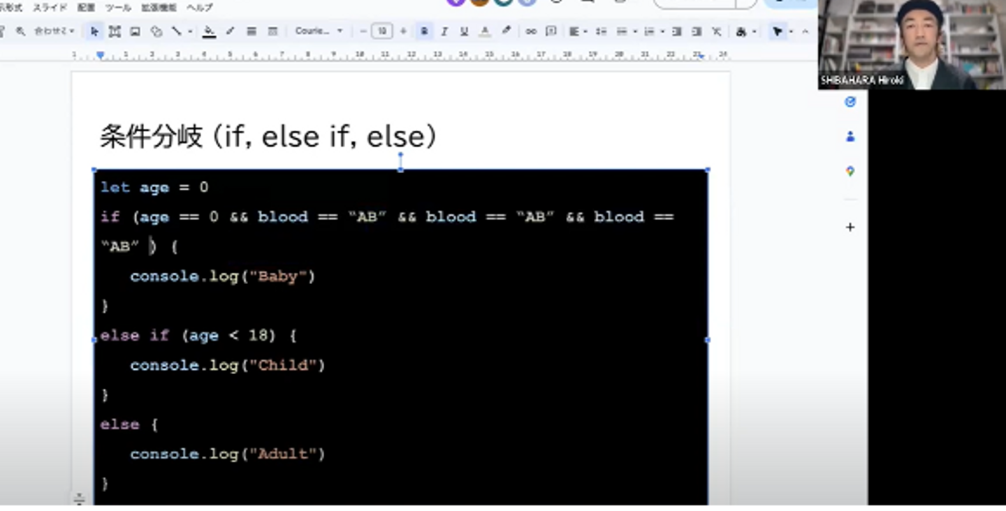 第2回は、JavaScriptの基礎についての講義です。3つのプログラミングの基礎である「順番にする・繰り返し・条件分岐」をブロックプログラミング言語であるScratchを用いてご説明いただきました。その後JavaScriptで変数、関数、繰り返し、条件分岐を実際にコードを書きながら学習しました。