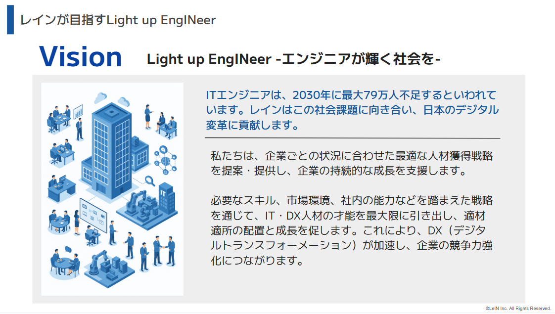 2025年時点では「株式会社レイン(LeIN)」で、私が創業した会社です。ITやDX人材に特化した採用業務代行サービスを展開しています。LeINはLight up EngINeer -エンジニアが輝く社会を- の実現に向けて、人材紹介会社ではなく企業側の立ち位置で人事の代わりに採用業務を行います。