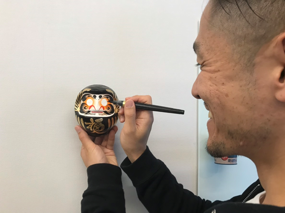 ということで、全社会議の最後にだるまの目入れを行いました。