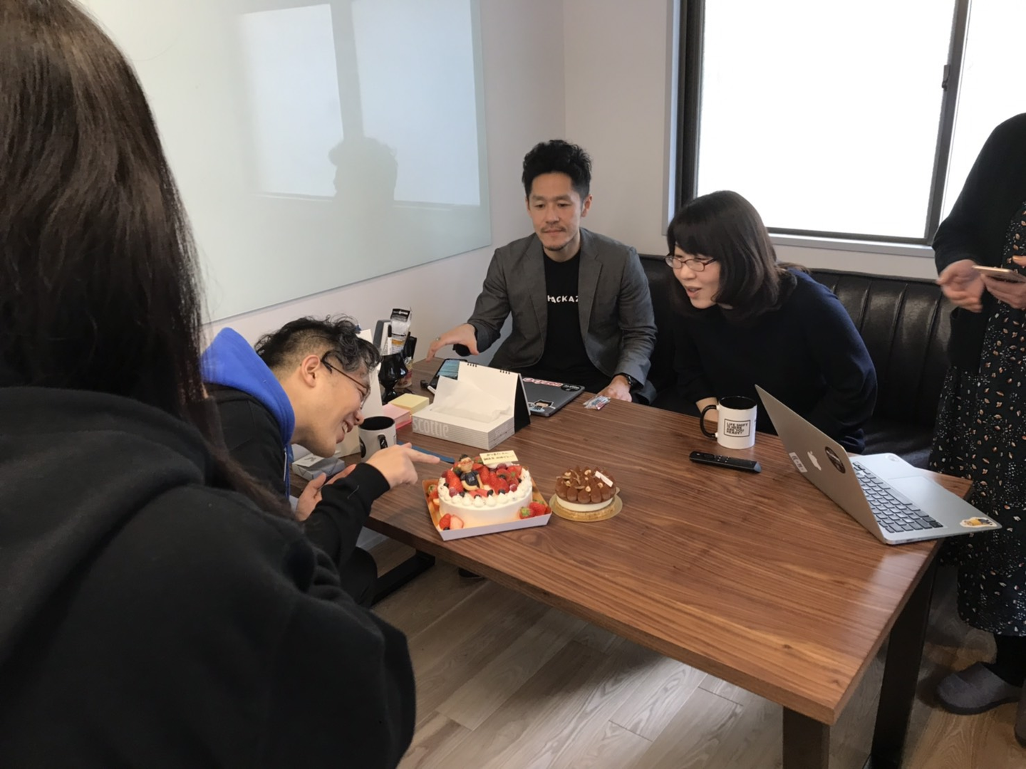 2月に誕生日を迎えるメンバーが多いハッカズーク(代表鈴木、取締役勝又、アルムナイ・リレーションシップ・パートナー大場の3名)ですが、先日2月27日に誕生日を迎えた取締役勝又の誕生日のお祝いの様子を少し紹介させていただきます。