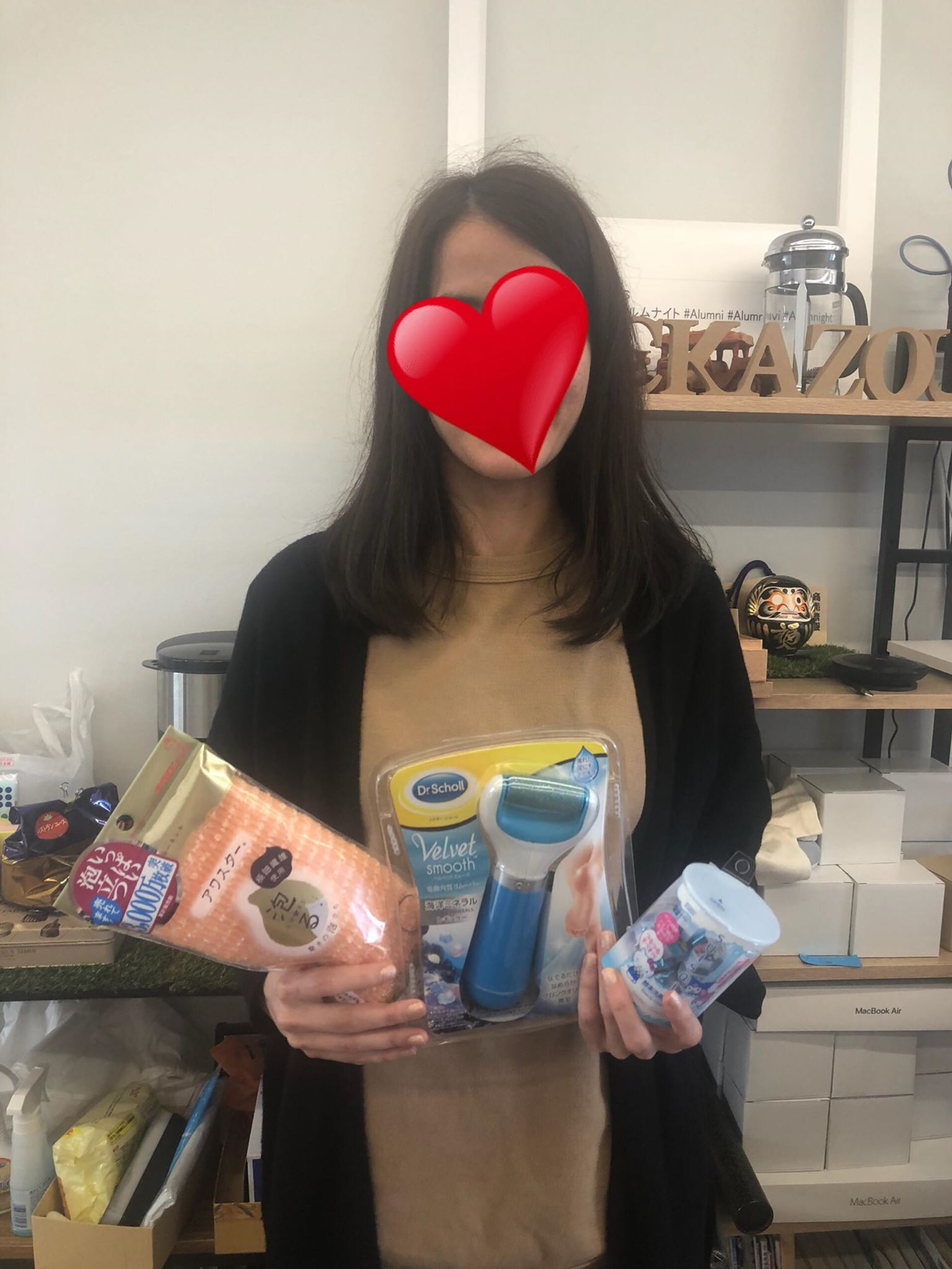 アルムナイ・リレーションシップ・パートナーの大場さんからは、体を洗うタオルや角質リムーバーをプレゼント。機能重視で実用的なものを好むHさん、大喜びでした★笑