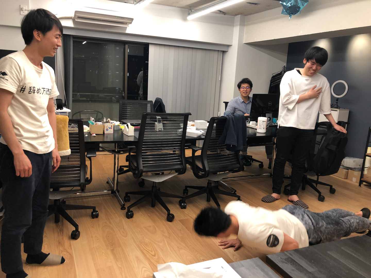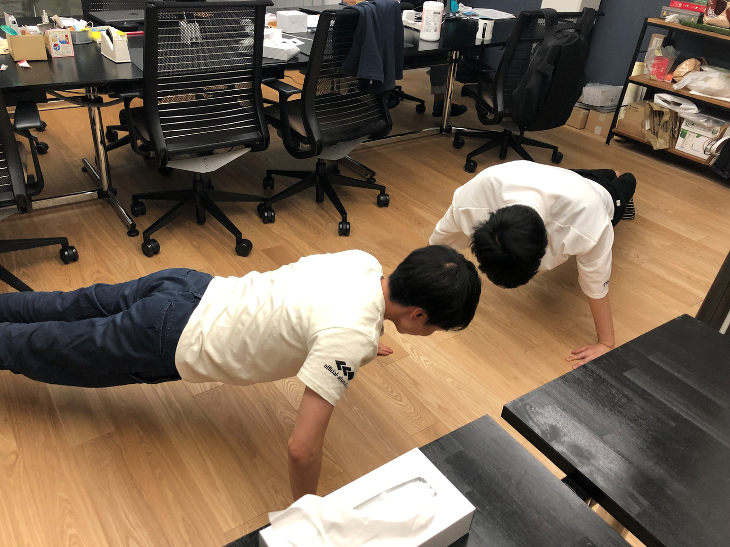 (鈴木に触発されてなぜか体も鍛えようとする實重さんと大学生インターン。※大人スタートアップなので普段はこんなことしません)