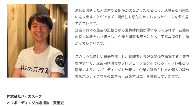 特に、ハッカズークの掲げる「辞め方改革」には今すぐに取り組みたいと思いました。元々、退職時の体験によって企業と退職者の関係性が急激に悪化してしまうことに、強い危機意識を持っていたんです。