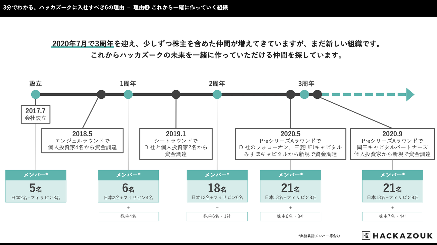 それでも、少しずつ応援してくれる方や、一緒にこのビジョンの実現に取り組んでくれる仲間が増え、設立から3年が経った2020年10月現在、業務委託メンバーなどを含むと、日本とフィリピンで合計21人のチームとなり、株主も4社+7名となりました。
