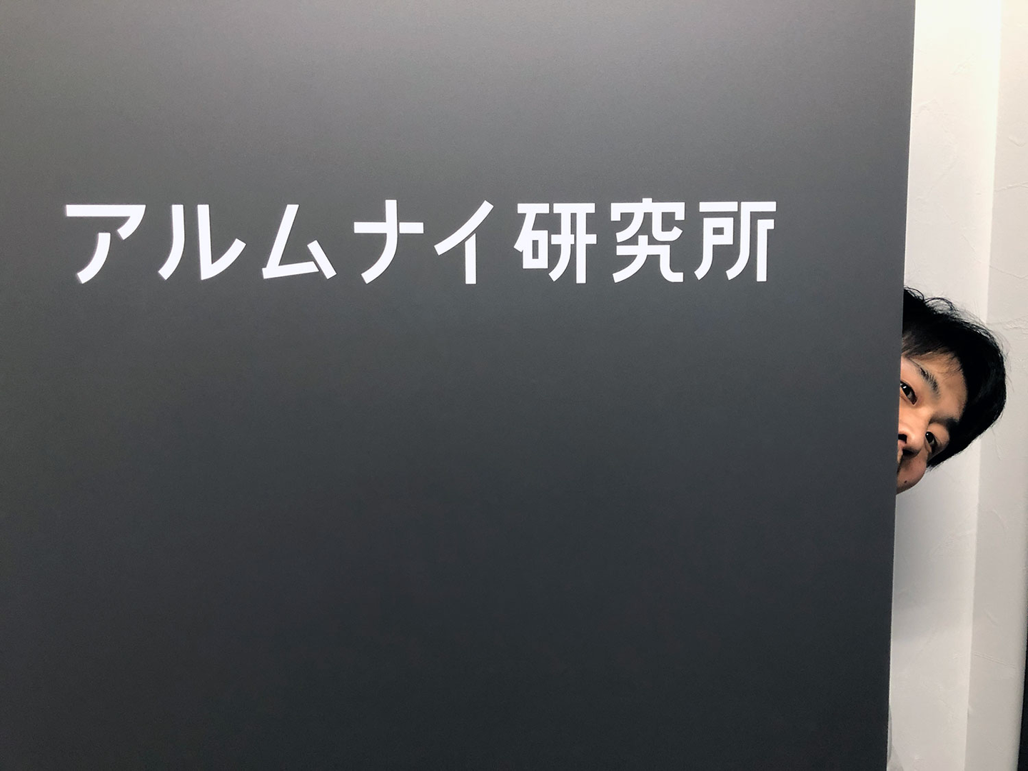 ▲会議室の扉にはアルムナイ研究所のロゴをあしらいました
