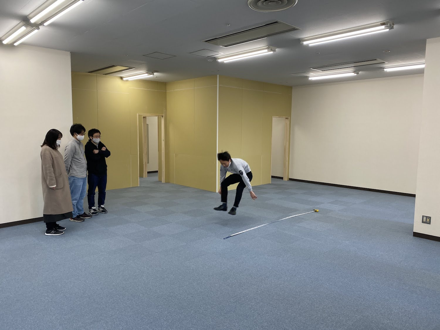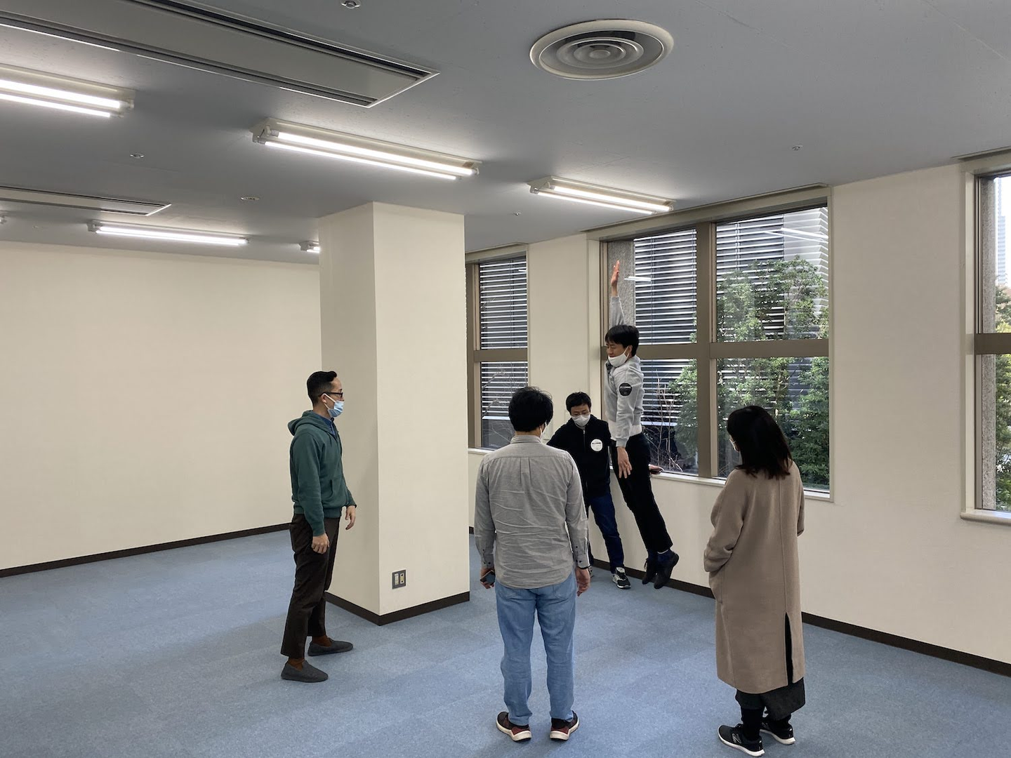 ▲工事前の新オフィスにて、広さを体で表現しようとする實重