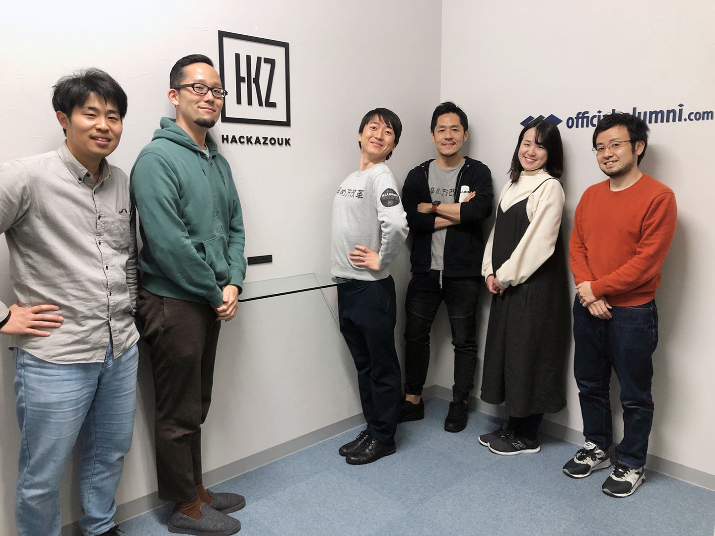 ▲前オフィス最終日の記念撮影でハッカズークのHを表現しようと頑張る様子。写真左から2番目の西田は何を……?
