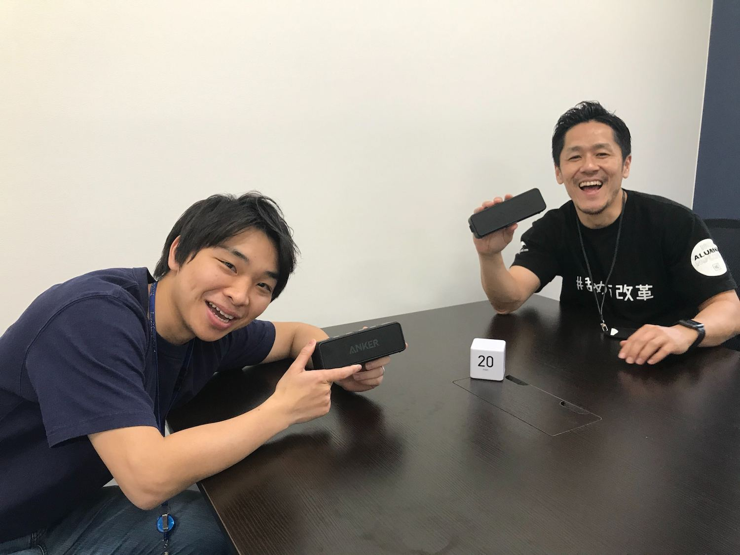 ミーティングの時間を区切るためのタイマーもいただきました。鈴木と金森が持っているのはスピーカー。時に業務に集中するあまり静かになりすぎるオフィスにBGMが流れることで、ちょっとした会話もしやすくなりました!