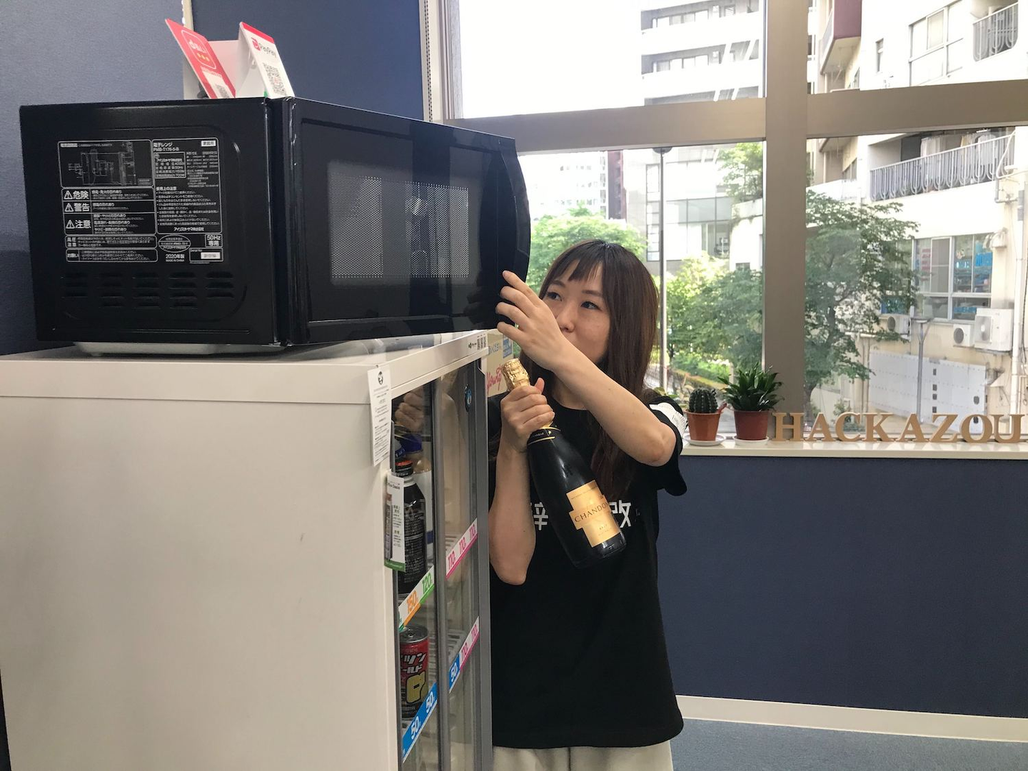 もう一つ、食生活を支えてくれているのが電子レンジ!ランチと夕方の夜食タイムにフル稼働しております。三市が手にしているシャンパンも、お祝いにいただいたもの。いつかおめでたいことがあったときに備えて、冷蔵庫で大事に冷やし中です。