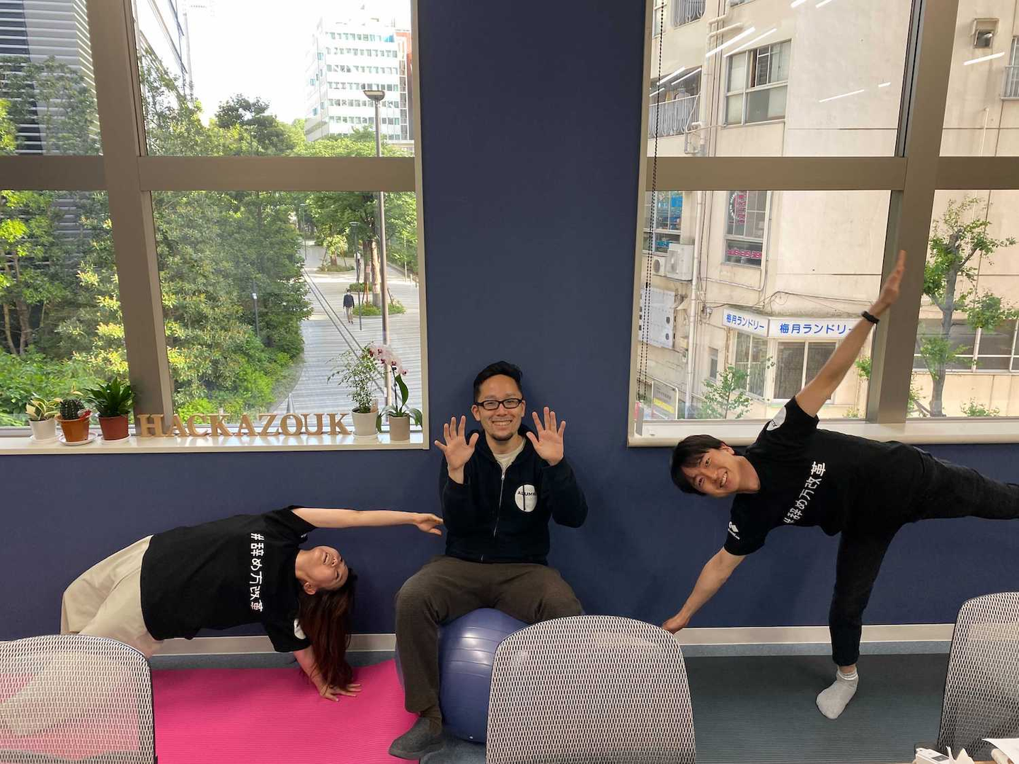 そんな三市はオフィスで不定期のヨガ講座を実施!プレゼントいただいたヨガマットとバランスボールで、デスクワークで凝り固まった体をほぐしています。健康経営。