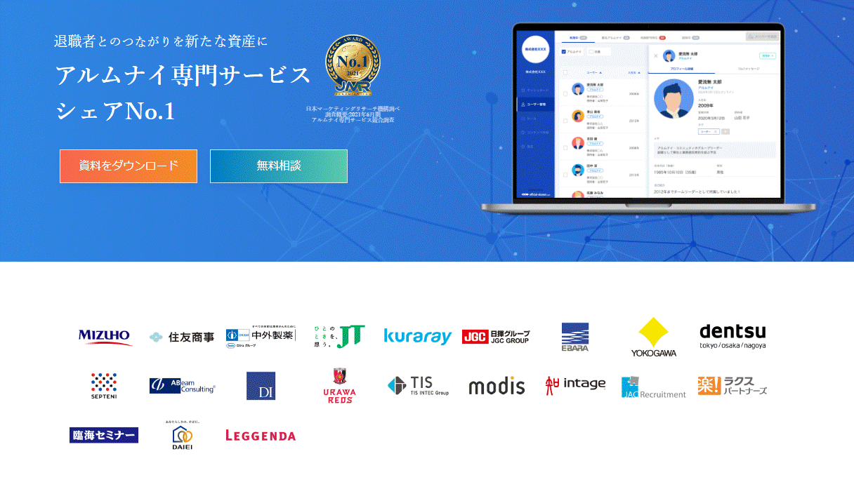 企業とアルムナイ(退職者)のつながりを活性化し、組織の成長につなげるためのクローズドなSNSです。これまで上場企業を中心に多くの企業に導入され、アルムナイとの関係構築を支援してきました。アルムナイ名簿、フィード、チャット機能など、アルムナイ特化型ならではのUI/UXを備え、企業とアルムナイのスムーズな交流を促進します。