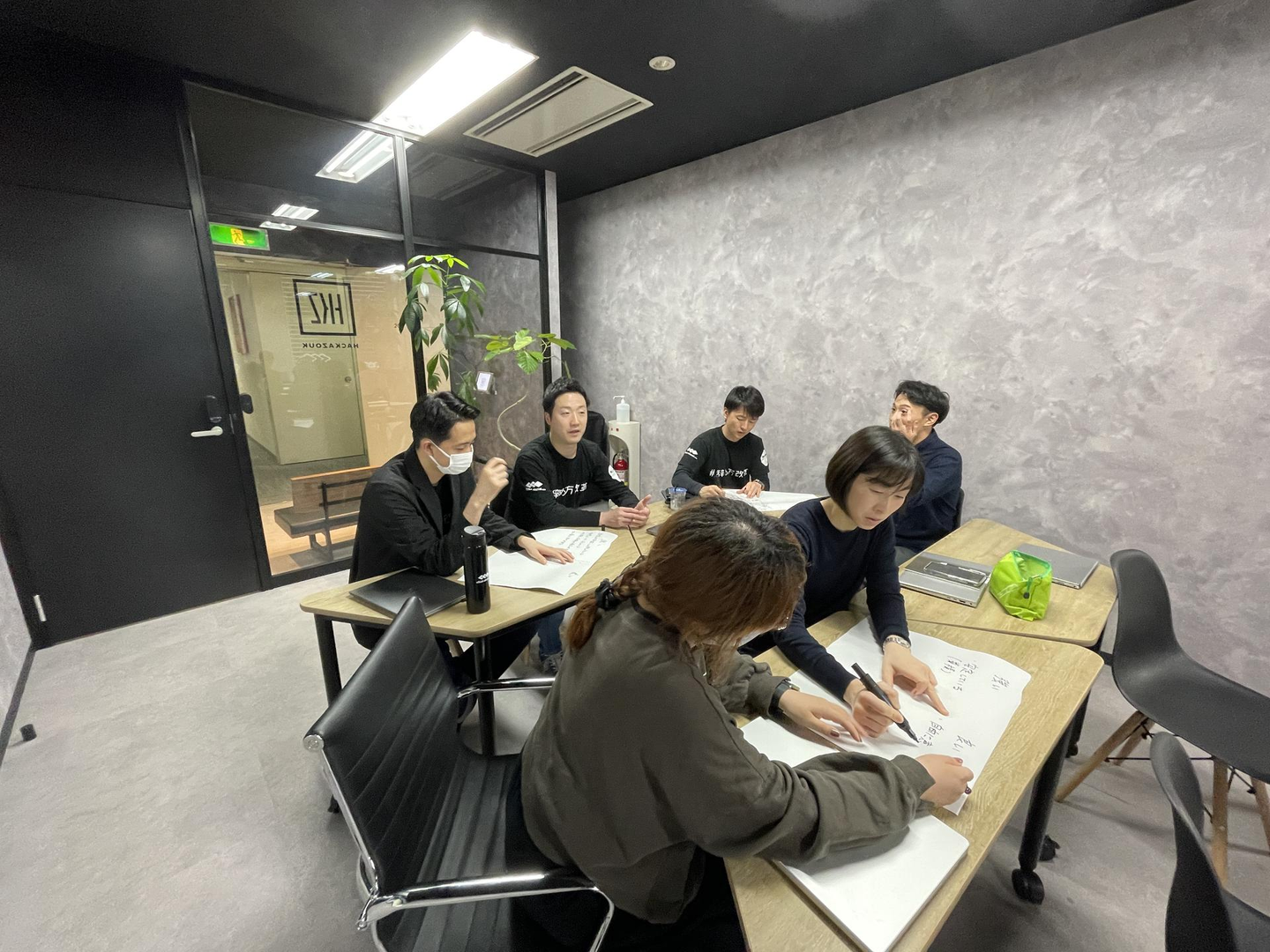 NTTドコモから1年間レンタル移籍中の藤居さんとハッカズークに新卒入社したやじー、デザイナーの吉村さんとARPアシスタントの川崎さん、入社から3年半で事業責任者のさねとARPアシスタントとして入社したばかりの山口さんなど、バックグラウンドや役割が違うメンバーでディスカッション。