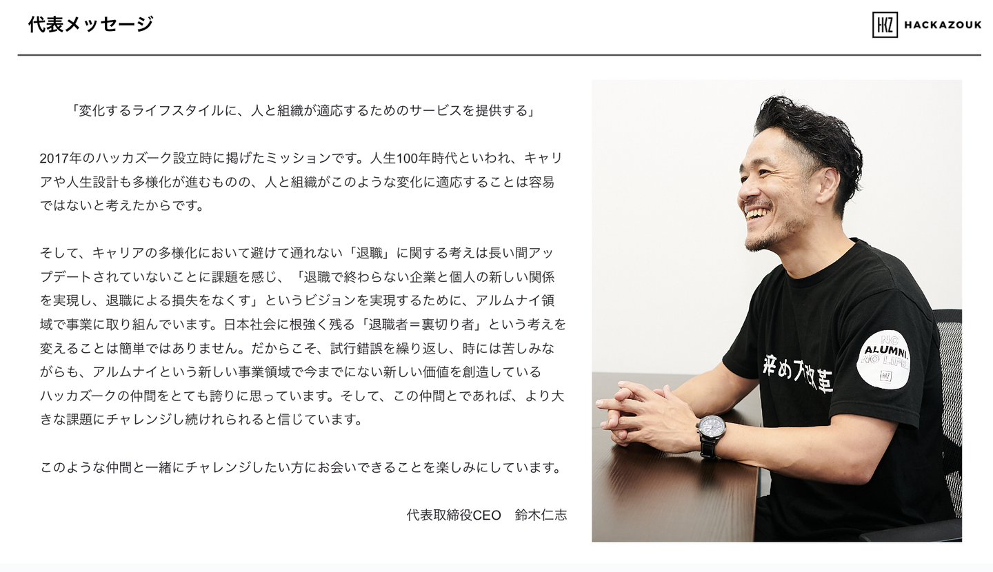 会社概要では、代表鈴木のメッセージ、社名に込めた想い、ハッカズークの歴史等をご紹介しています。