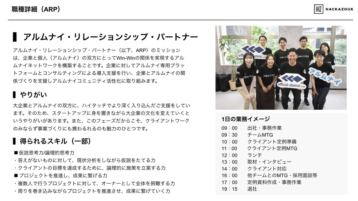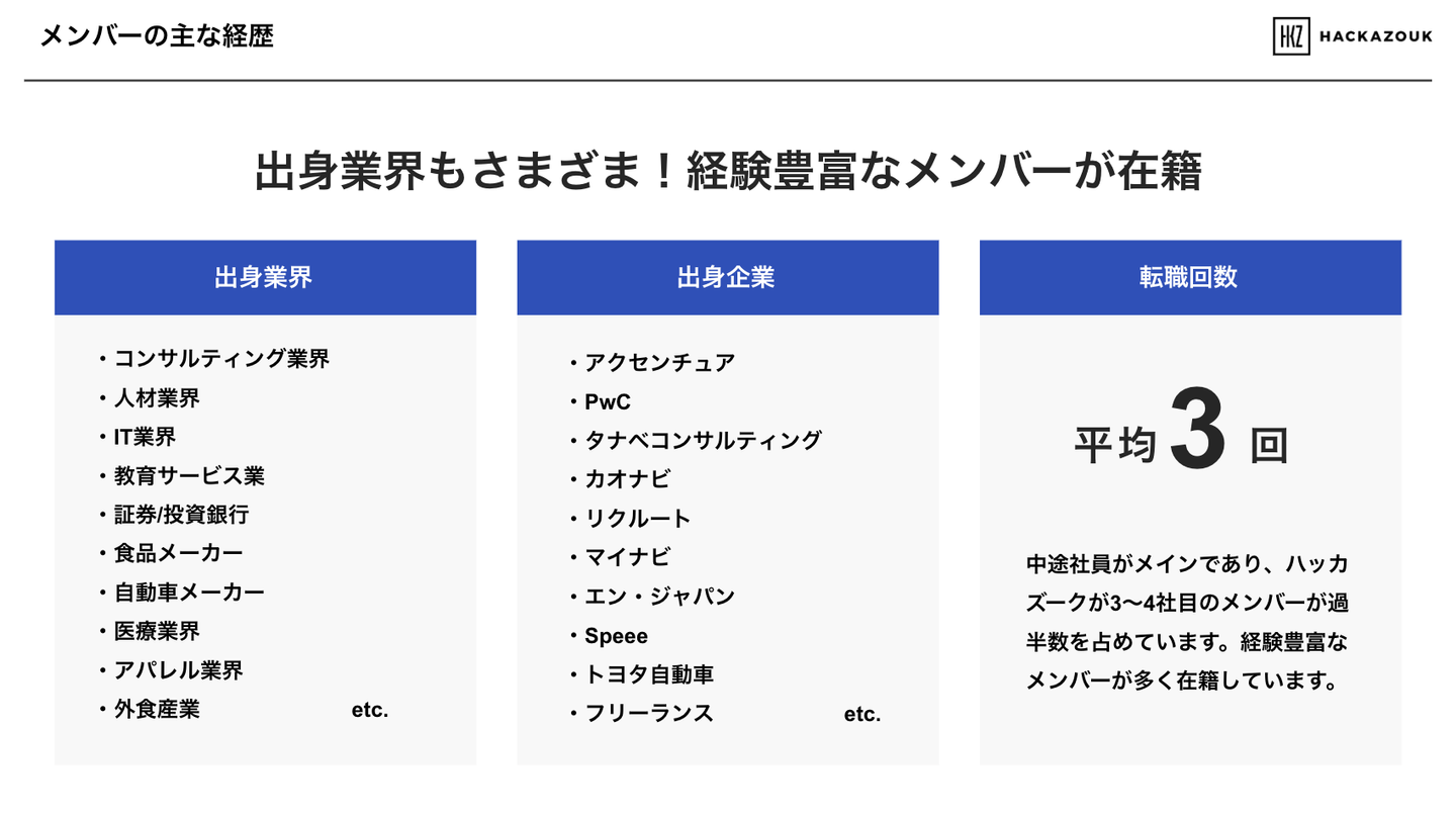 組織紹介では、ハッカズークが「大切にしていること」から、組織の年齢構成や男女比、職種比率、出身業界までまとめています!