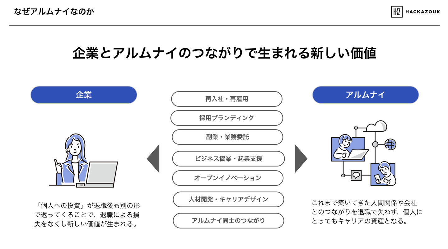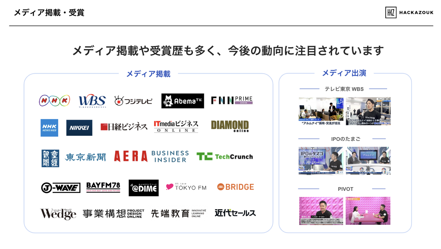 事業紹介では、「なぜアルムナイなのか」の説明から、事業・プロダクトの紹介、導入実績やメディア掲載・受賞歴を紹介しています。