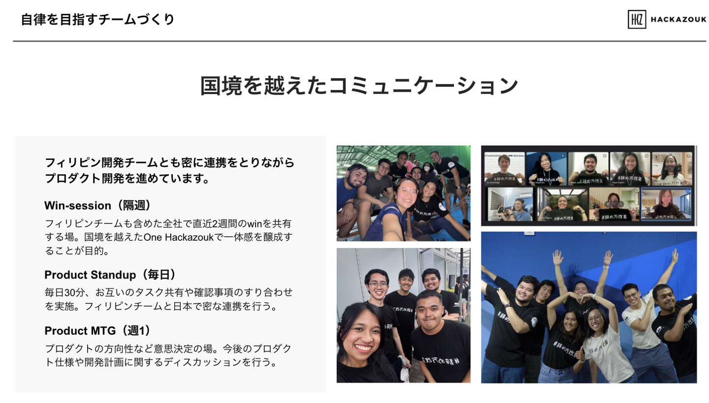 働く環境では、働き方・福利厚生、オフィス環境だけでなく、全社で行なっているMTGの紹介やフィリピン開発チームの紹介もしています!