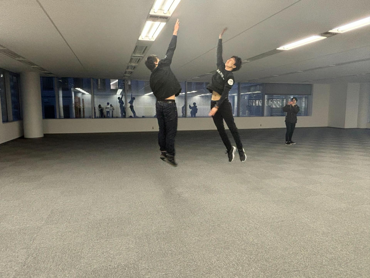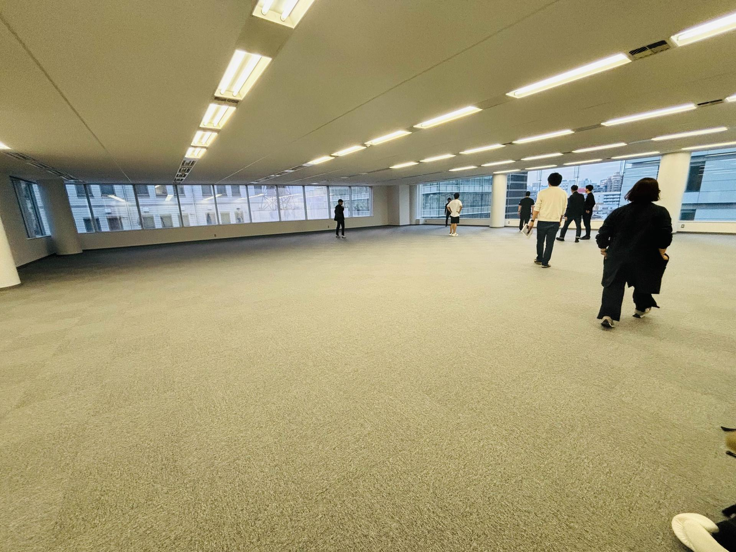 前回の移転時同様、工事前の新オフィスにて、広さを体で表現しようとする實重と金森ペア。
