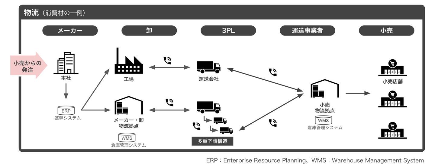 物流プロセスには様々なプレーヤーが存在しており、事業内容・規模が異なるプレーヤー間で物を運ぶための情報がアナログ(電話・FAX)でやりとりされている。