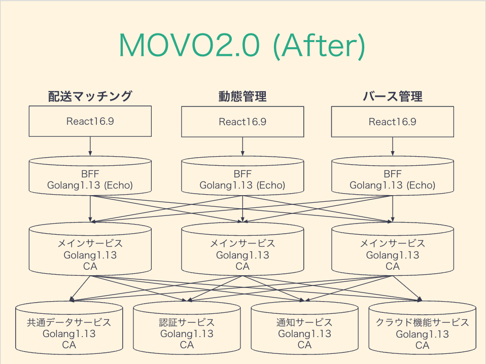 戸井田(CTO):もともとMOVOの各プロダクトは、それぞれ異なるプログラミング言語やアーキテクチャで構成されていました。創業当時は、各エンジニアの得意な言語で一刻も速くリリースし生き残ることが最優先だったからです。ただ、運用をしていく中で、PMFが見えてきたり、会社のフェーズが変わったり、それなりに技術負債も貯まり、属人化も進みと、あるあるの展開をむかえたのです。そこで2019年、目先ではなく未来のHacobuに投資すべく全プロダクトをフルリプレイスしました。具体的には大きく3つのことを実現したかったからです。