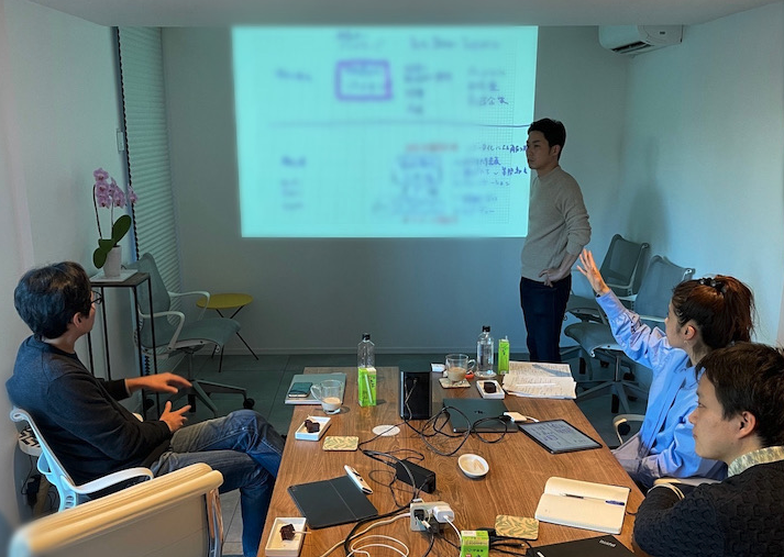 1日合宿の様子。左からCEO太郎、COOまさる、もりこ、CFOユイ。こういう議論は、やはり・・・リアルが良いですね。