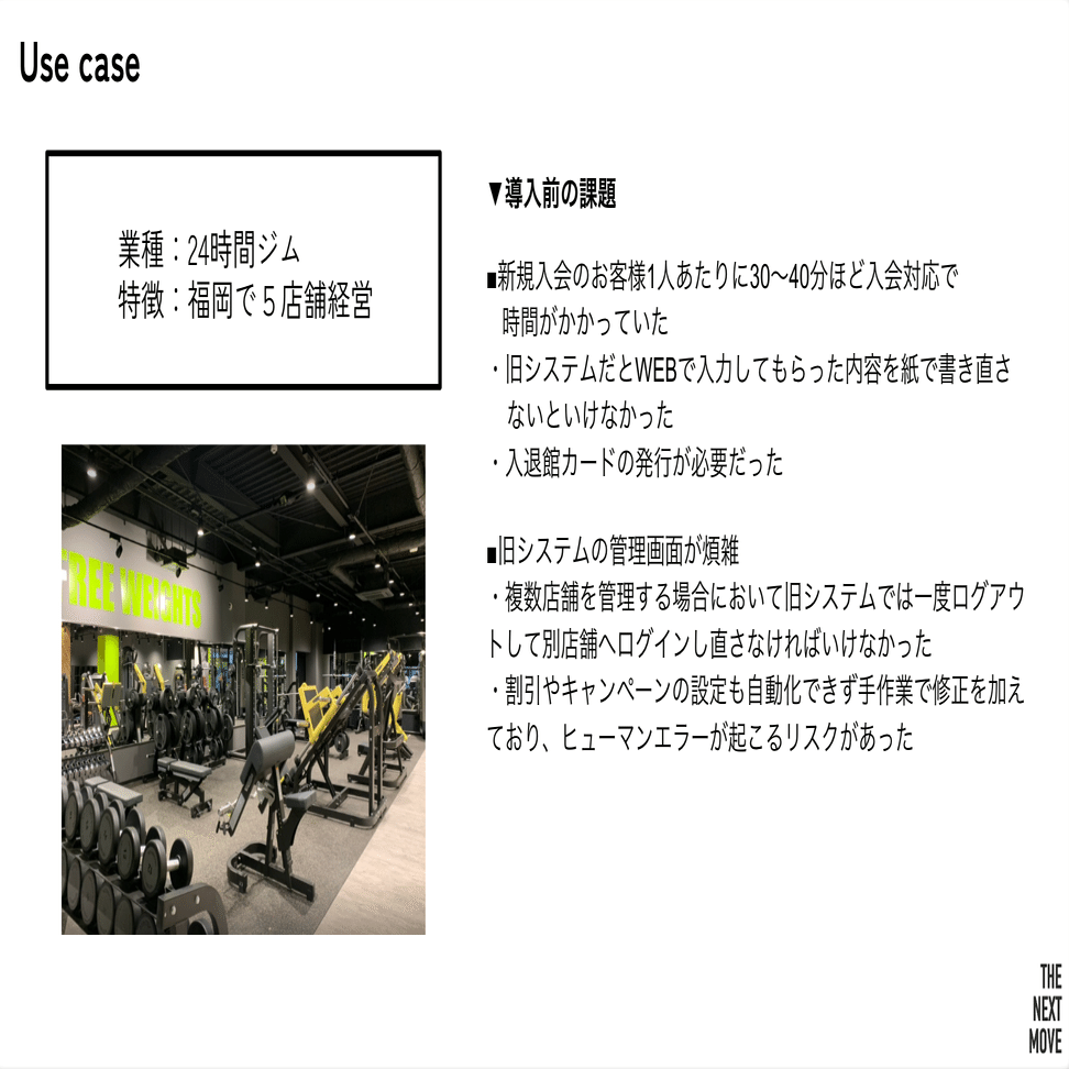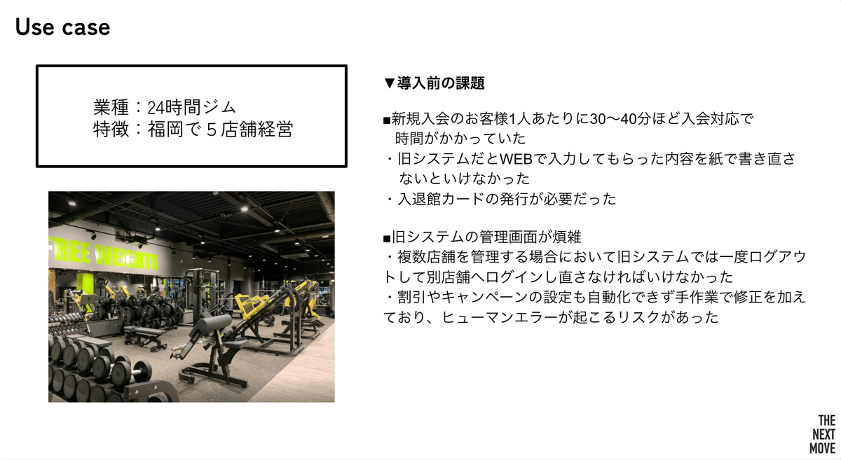 導入前の課題は主に2つです。1つは、新規入会のお客さま1人あたり30〜40分ほど入会手続きに時間がかかっていたこと。Webで登録した情報を口座振替用に紙で書き直して提出する必要があり、さらには入館カードを発行して会員様にお渡しする作業が必要でした。