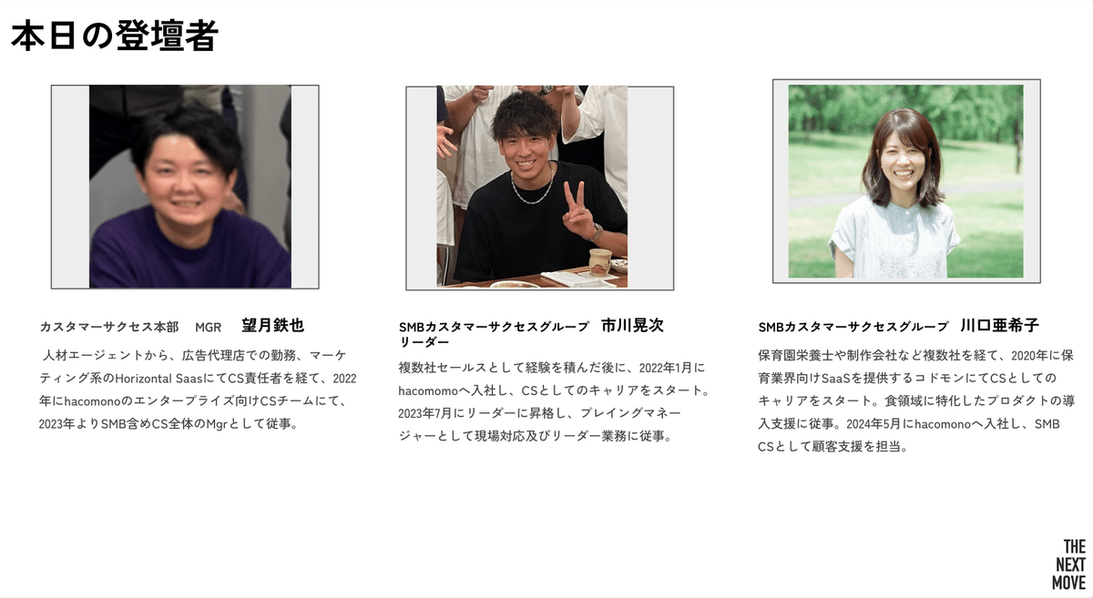 2025年3月5日に「THE NEXT MOVE for CS 〜経営支援までを伴走するCSの在り方〜」を開催。登壇したのは、カスタマーサクセス本部 マネージャーの望月鉄也、SMBカスタマーサクセスグループ リーダーの市川晃次、SMBカスタマーサクセスグループの川口亜希子です。人事の安本智奈美が進行を務め、カスタマーサクセス本部(以下、CS)が背負うミッションや役割、「hacomono」の解約率0.5%以下を実現できる理由などについて語り合いました。