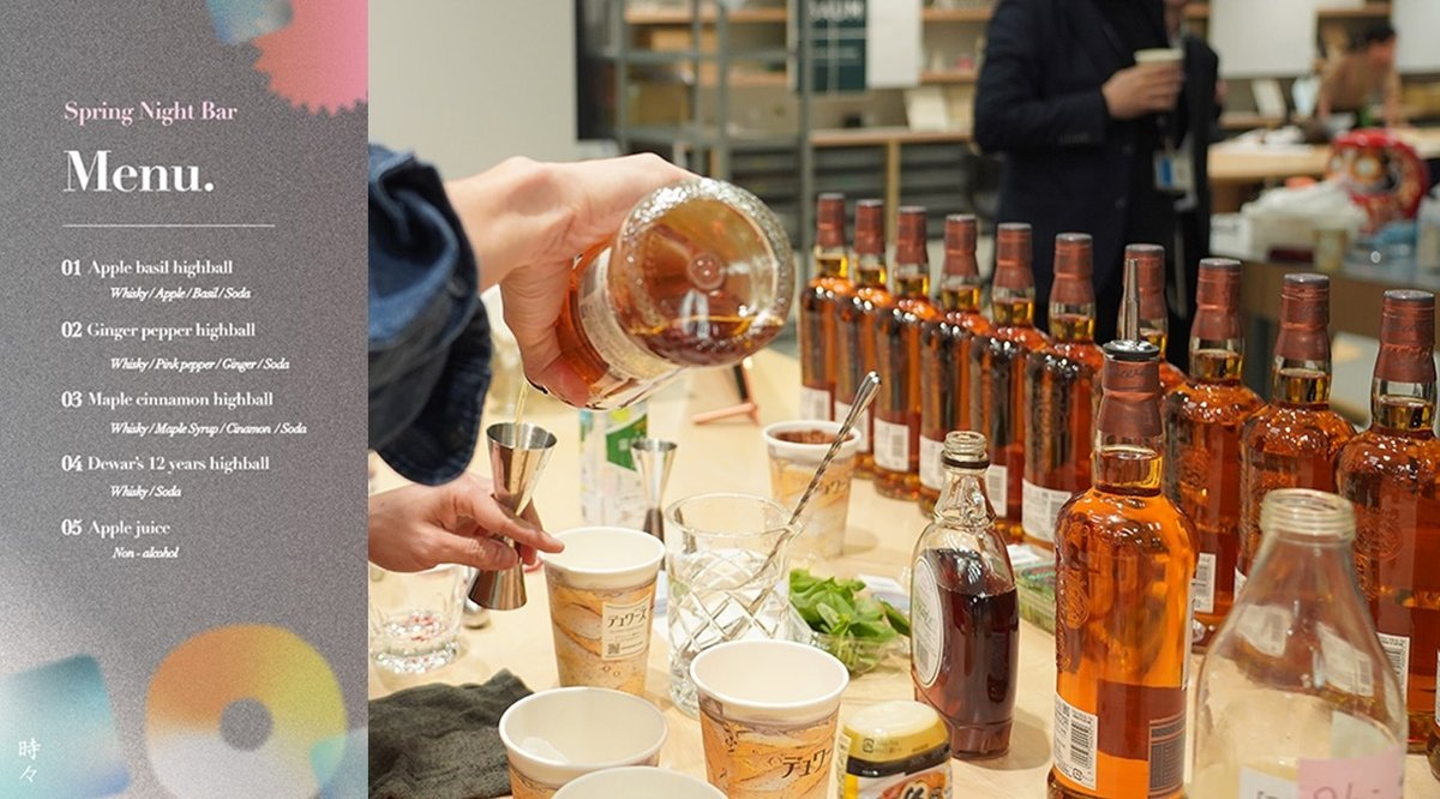 先日、新年度初の金曜の晩に、博展の京橋オフィス内cafeエリアで、Barを模したイベント「時々-tokidoki-」を開催しました。今回はなんとバーテンダーも博展社員!18時にオープンしたBarは、19時には大盛況となりました。