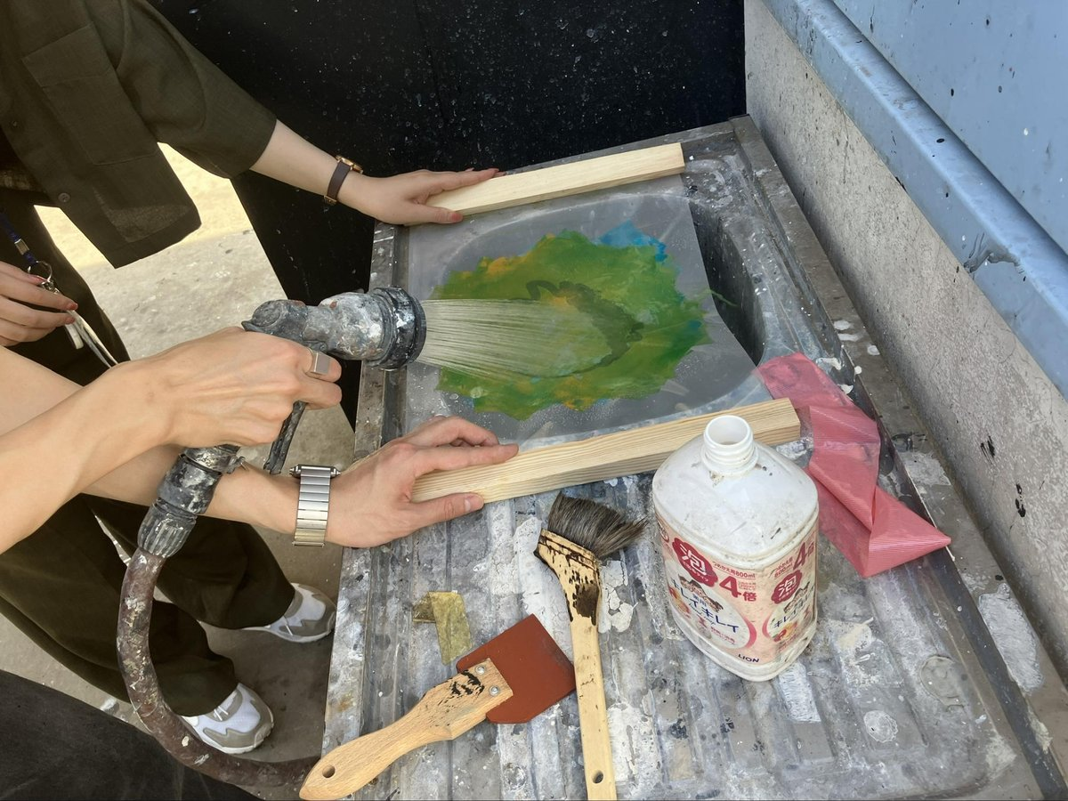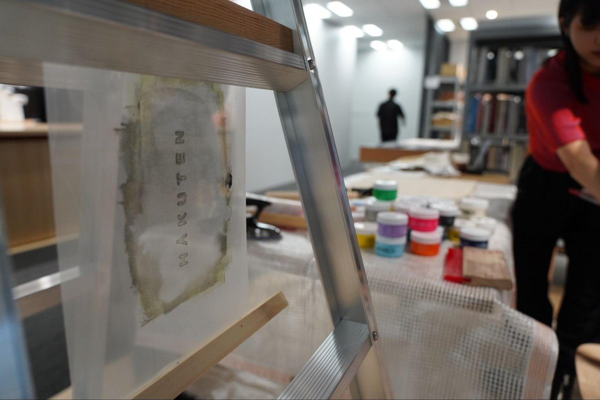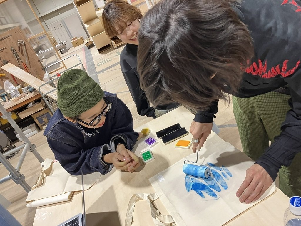 大人数のワークショップ、版洗う時間なくない? だったら、使った人の色をどんどん引き継いでいって、社員同士のカラーが混ざり合っていくのも博展らしくて良いかもねと話してみたり。