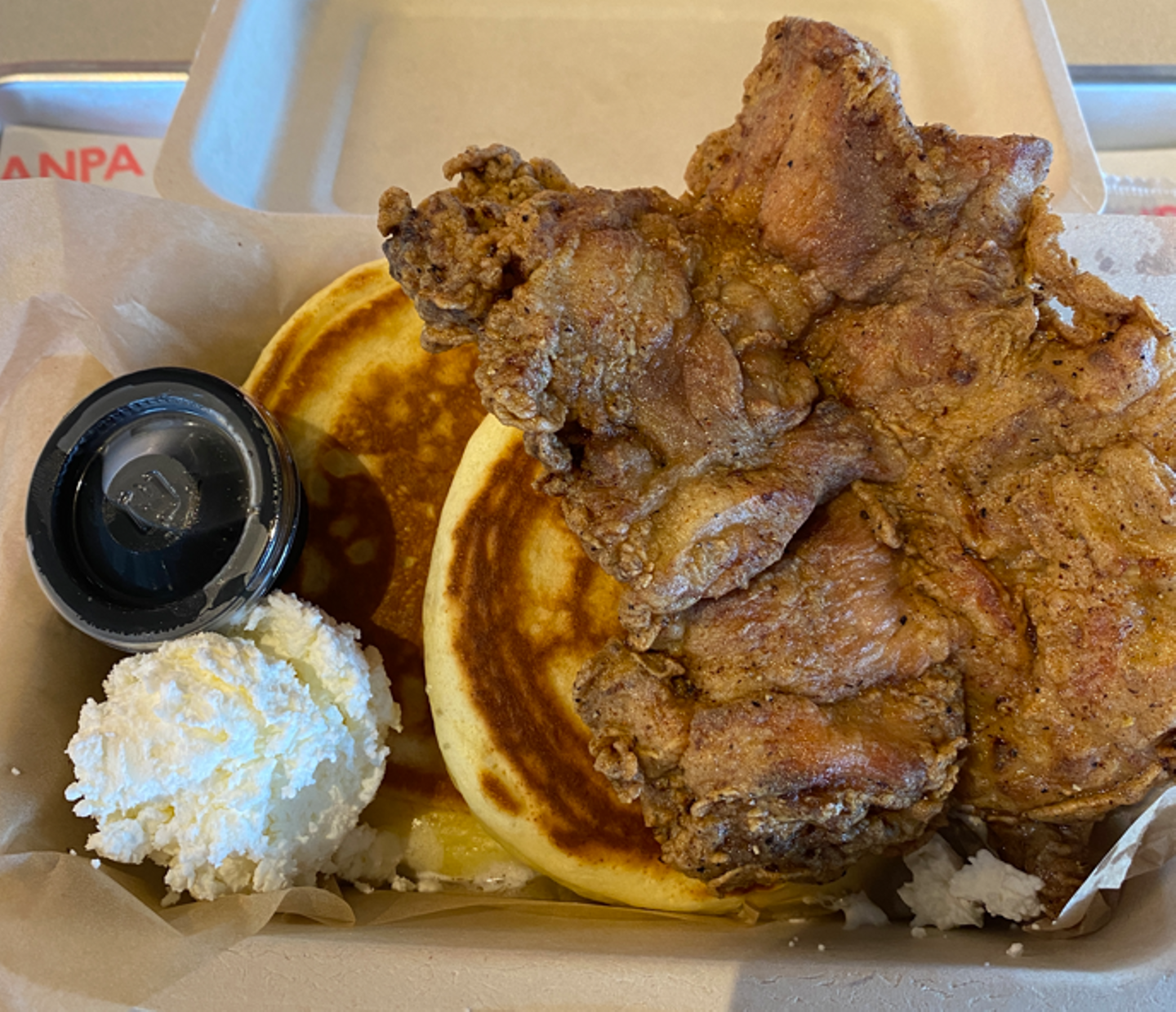 東京ではお目にかからない「フライドチキンパンケーキ」を食べました。