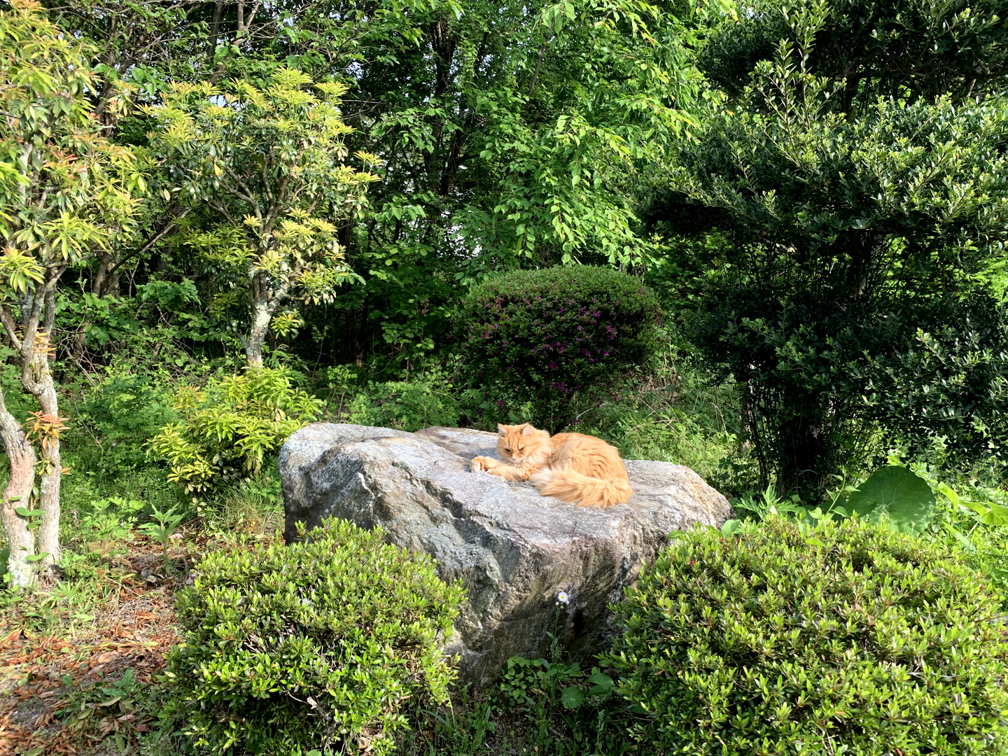 (仕事部屋から見える庭でくつろぐ愛猫)